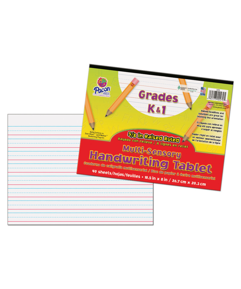 The Multi-Sensory Raised Ruled Paper has raised headlines and baselines which help students stay within the guidelines. It helps teach handwriting through two senses, sight and touch. The headlines are blue and the baselines are red. It has a 5/8" ruling, 5/16" dotted midline and 5/16" skip space and conforms to both D'Nealian® and Zaner-Bloser™ handwriting styles. Tablets contain 40 sheets with a heavy chipboard back and protective retail-friendly cover. Recommended for Grades K and 1. Measures 10.5" x 8".