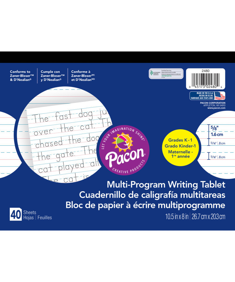 Our Pacon® Multi-Program Handwriting Papers offer rulings that conform to both the Zaner-Bloser™ (Grade 1) and D'Nealian™ (Grade K) handwriting programs. Bright tablet paper ruled both sides with red baselines, blue dotted midlines and blue headlines. Tablets have a heavy chipboard back and protective full page, four color, retail-friendly front cover. Recyclable. Ruling: 5/8" (long way). Dotted Midline: 5/16". Skip Space: 5/16". Includes 40 sheets. Measures 10.5" x 8".