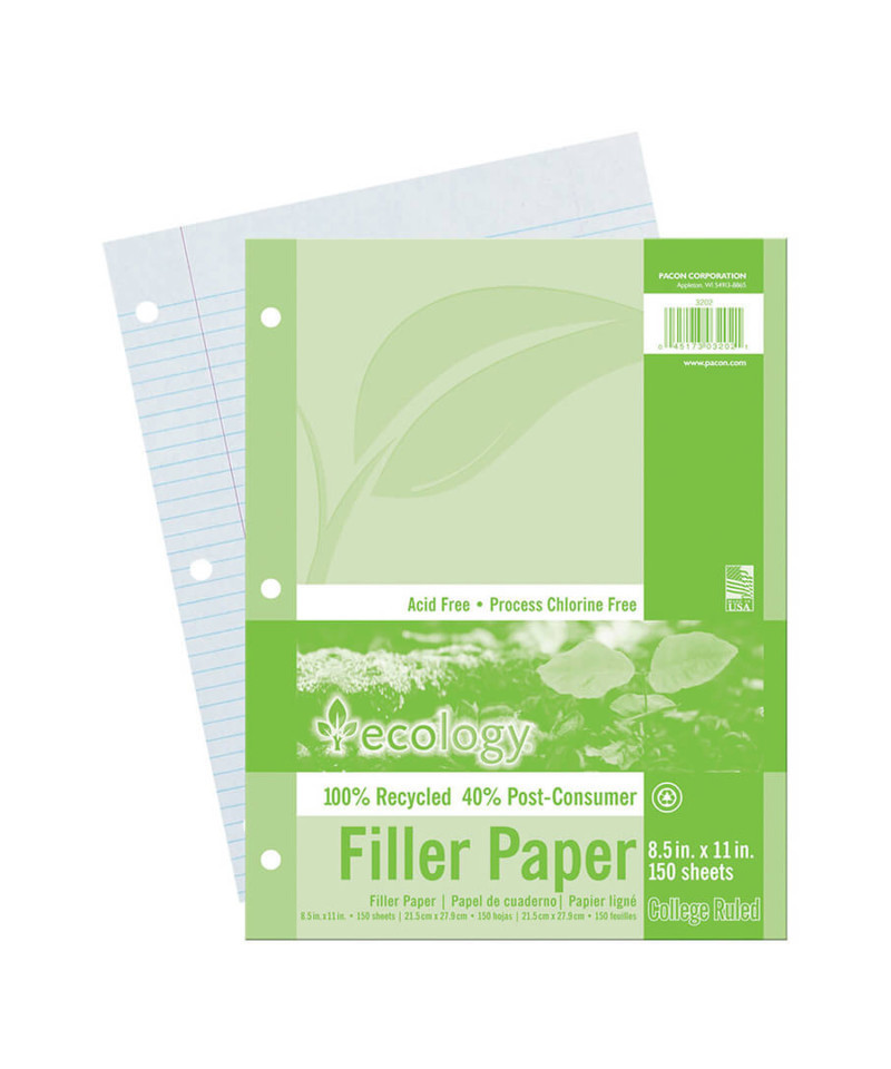 An environmentally friendly filler paper! This recycled filler paper contains 100% recycled content with 40% post-consumer fiber. Each sheet is 3-hole punched, and each package is film wrapped. Acid-free and process chlorine free. Ruling: 9/32" (college ruled). Measures 8.5" x 11". Includes 150 sheets.