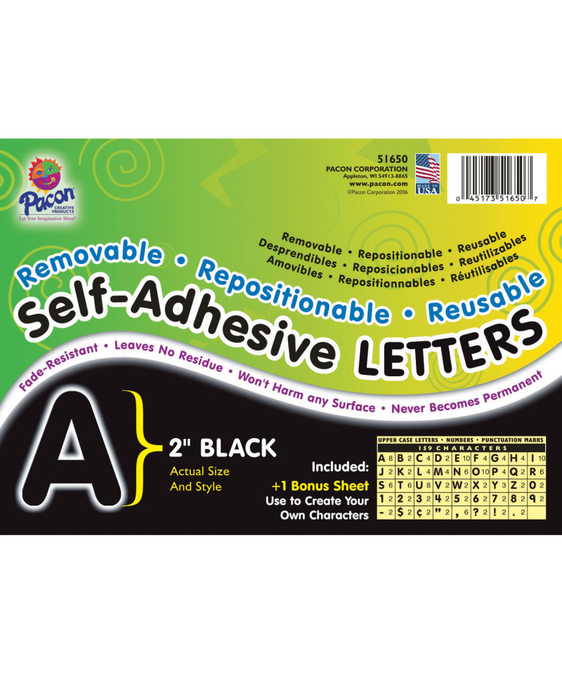 A unique adhesive makes these letters removable, repositionable and reusable. They are easy to use - just "peel and place". They adhere to any clean and dry surface that is smooth or slightly textured (even wood and painted brick walls). Fade-resistant, acid free, leaves no residue and never becomes permanent. Each package contains uppercase letters along with numbers and punctuation marks. Ideal for bulletin boards, signs, posters, presentation boards and much more. The 2" letters have 159 characters per pack.