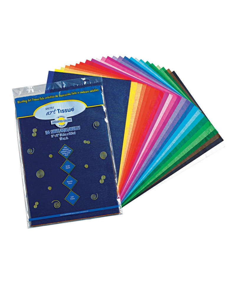 Spectra® Deluxe Bleeding Art Tissue™ is a fine-quality deluxe-grade tissue that bleeds, making it easy to create arts and crafts projects with a beautiful watercolor look. Rich, vibrant colors blend when moistened to create exciting artistic effects. Wet with a brush and wash beautiful, translucent color on to the paper. Overlap two colors and watch them blend. Or, add glue to the water to hold specific shapes in place and create magnificent, multi-layered effects. The high-quality tissue can withstand cutting, crinkling and folding without tearing. This 25 color assortment includes: National Blue, Dark Pink, Canary, Goldenrod, Orange, Chinese, Scarlet, National Red, Cerise, Baby Pink, Blush Pink, Magenta, Orchid, Purple, Medium Blue, French Blue, Sky Blue, Azure Blue, Emerald Green, Apple Green, Spring Green, Leaf Green, Seal Brown, Black and White. Sheets measures 12" x 18". Includes 100 sheets.