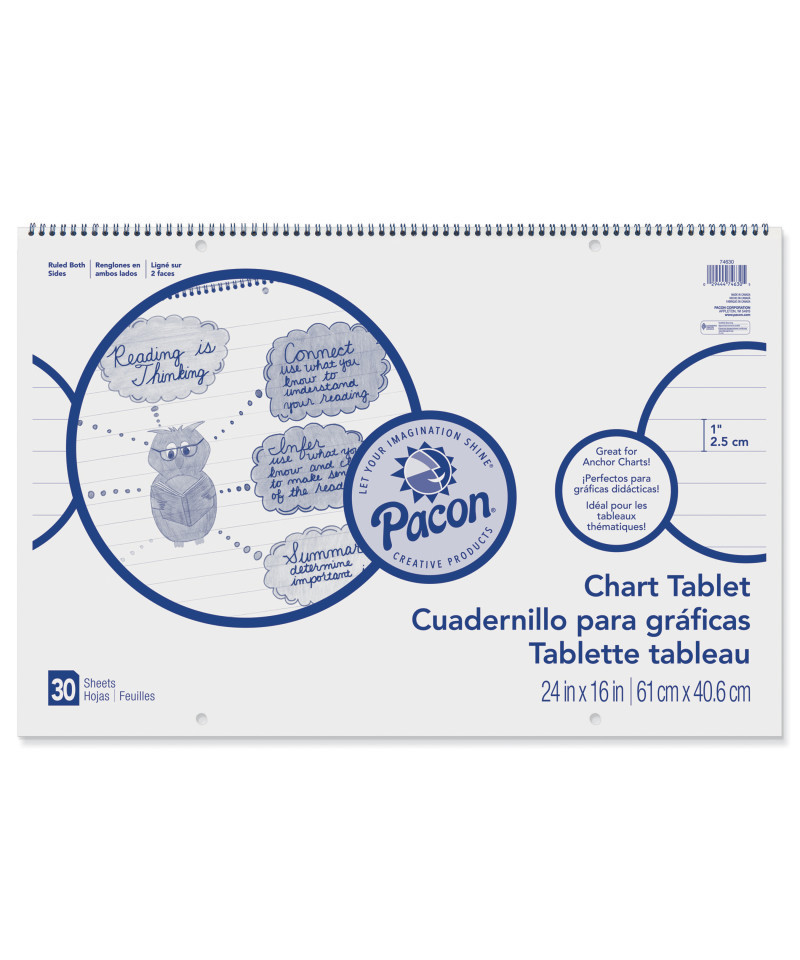 This Chart Tablet features White sulphite bond paper that is spiral bound to stiff covers with a Cursive alphabet printed inside. It is 2-hole punched for easy hanging. Paper is 1" ruled on both sides, and works well for classroom anchor charts, posters and other teaching aids. Measures 24" x 16". Each tablet includes 30 sheets.