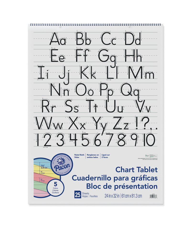 Traditional chart tablets made with pastel colored bond paper. Each tablet contains assorted colors: Yellow, Pink, Salmon, Blue and Green. Sheets 1-1/2" ruled the short way, spiral bound and 2-hole punched. Includes a 3/4" dotted midline and 1/2" skip space. Recycled and Recyclable. Measures 24" x 32". Includes 25 sheets.