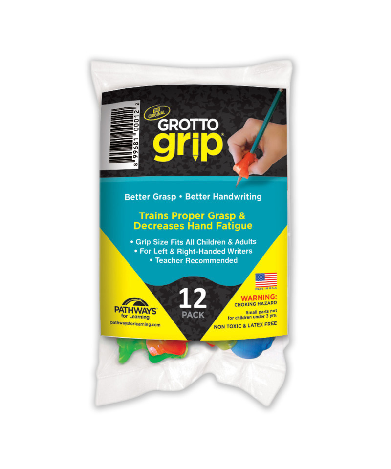 The pencil grasp trainer targets and activates the proper muscles for writing™. This patented ergonomic grip was designed and tested by an occupational therapist to train the proper grasp, corrects the pencil grip and improves handwriting. The finger guard and unique angles places and HOLD fingers in the proper position to decrease hand fatigue. For both left & right-handed writers. Non Toxic & Latex Free. Assorted colors. Pack of 12.