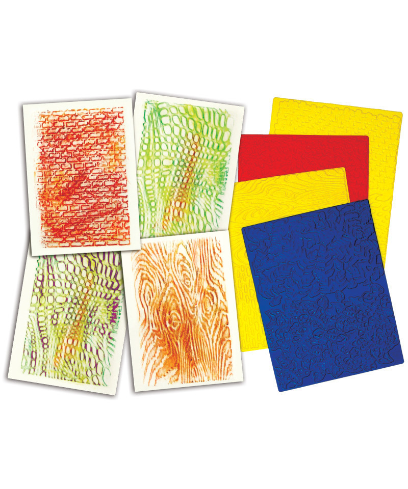 Texture Rubbing Plates are versatile and fun for art, design, science, geography and much more! This hands-on, easy product is sure to enhance learning concepts. Add texture to artwork by placing paper over a plate and rubbing with a crayon, marker or pencil to make the design emerge. Layer designs for more effects. Fill with or press into modeling clay. Great with paper mâché. Make sun catchers using white glue and food color. Simply fill tray and let dry. Peel the resulting mold off and you’re done. Each set includes a guide with craft ideas. Plates measure 8-1/2" x 11" (22 x 28 cm). Each pack includes 4 rubbing plates.