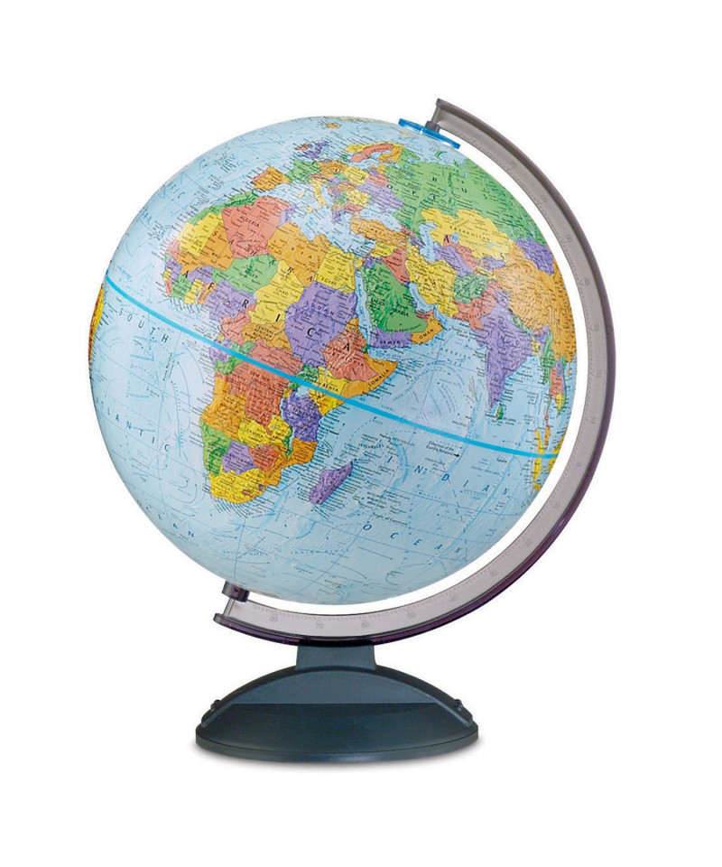 This wonderful world globe features over 4000 place names and political boundaries. This globe is held by a durable, scratch resistant base and semi meridian. The semi meridian features the degrees of latitude. Standing 16" tall, this globe is affordable and one of our best selling models. It is perfect for the home, office or dorm room. The size lends itself to fit nicely on shelves, desktops or conference room tables. The vivid colors highlight the raised relief embossing and political/geographical aspects of this up to date globe map. A great value and a wonderful gift, this world globe is perfect for home schooling or for the student with a interest and love for geography. Recommended for ages 8 and up.