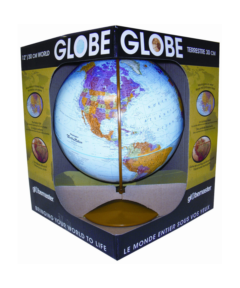 The Replogle Explorer 12" Desktop Raised Relief Blue Ocean World Globe is among our most popular models. Striking colors and vast amount of information will peak the interest of any geographical connoisseur. This blue ocean globes features over 4000 place names and political boundaries. The globe is held by a gold painted durable, sturdy base and numbered semi meridian that marks the earth's degrees of latitude. The raised relief embossing reveals the world's main mountain ranges in a three dimensional way. This world globe is a great value and the perfect size and for desktops and book shelves. A great STEM teaching tool for classrooms or at home learning. Packaged in a display box.