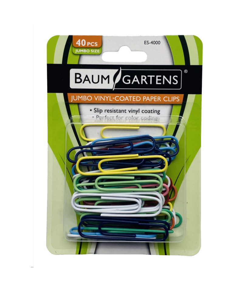 When you need a big clip for a big job, Baumgartens Jumbo Vinyl Paper Clips are perfect for bigger jobs like holding cards or papers together, bookmarking pages or clipping files. Stylish and coated in a colorful vinyl, these clips are great for the office, home or classroom. Includes 40 jumbo, 2" paper clips per pack.