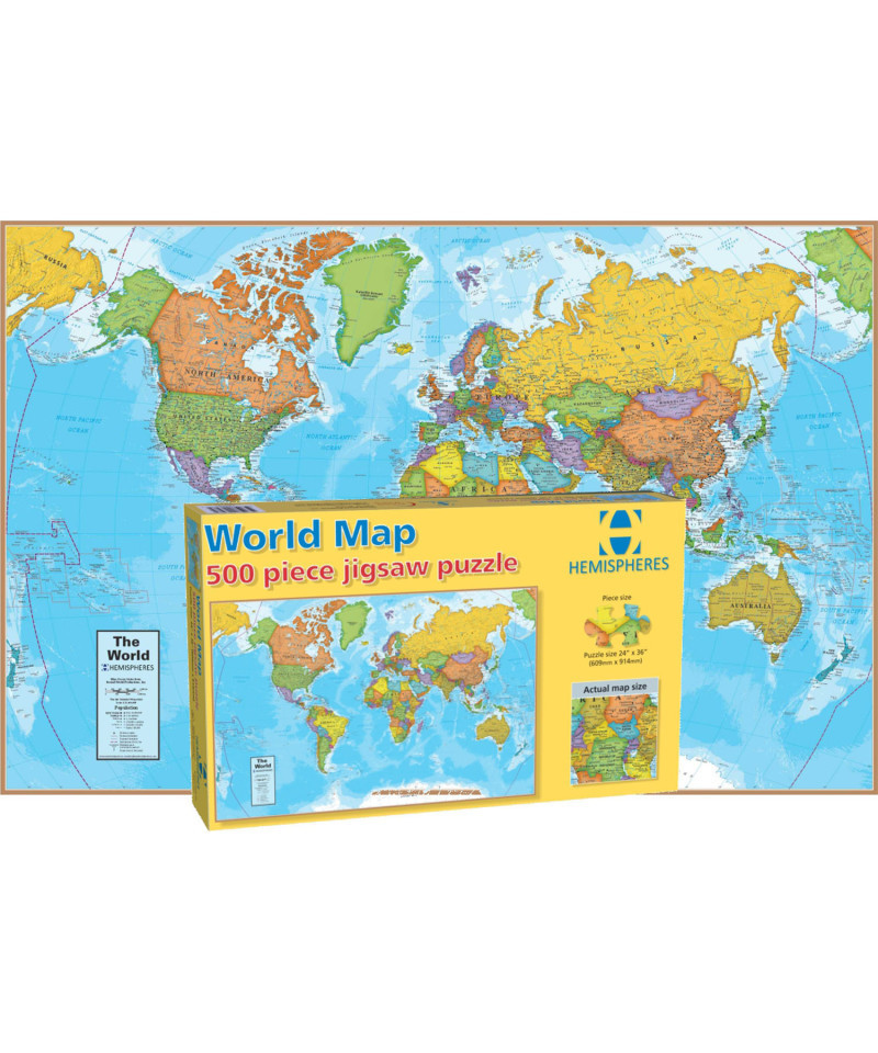 The 500 piece World Puzzle is a colorful detailed puzzle with all countries included! It is a fun challenge to put this quality 500 piece puzzle together. This puzzle comes in a sturdy box and measures 24" x 36" and is for ages 8 and up.