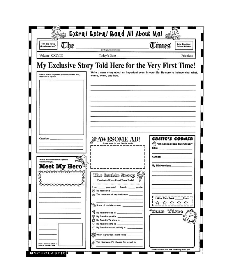 My Exclusive Story: Brainstorm the types of events students would like to write about. Ideas can include a vacation, a sporting event, an experience with a pet, or the arrival of a new family member. Have them think about the important details of the story and how to organize the information. Remind them that as with newspaper articles, they should lead with the most important information.