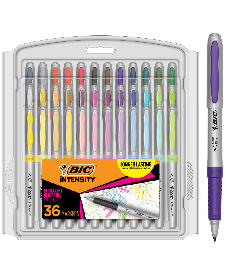 Perfect for adult coloring books and craft projects, BIC Marking Permanent Markers bring a bold, colorful flair to your creations. This permanent marker set unlocks your creative options with a vibrant assortment of fashion-inspired colors. Each marker comes equipped with an ultra fine point and a soft rubber grip that enhances your control. The low-odor, acid-free ink (no added acid, no measurable pH) is capable of marking on almost any surface--from glass and metal to photos and foils. With 36 colors at your disposal, you'll have all the choices you need to bring your doodles, art projects, and coloring pages to life. Includes 36 BIC Marking Permanent Markers, Ultra Fine Point (0.6 mm), Assorted Colors.