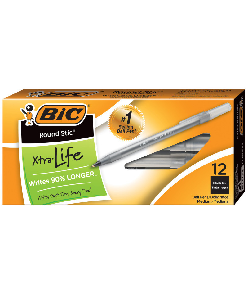 BIC® Round Stic® pens are a lightweight round barrel pen for comfortable writing. Tough, durable tungsten carbide point insures the smoothest of writing. Features a medium point and the cap and end plug color indicate the ink color. It is easy to identify and is designed for long-lasting dependability. Features a ventilated cap and tungsten carbide ball. 1 Dozen black Pens.
