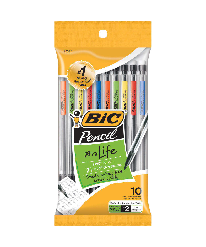 Enjoy smooth writing with the durable BIC Xtra-Life Mechanical Pencil. One BIC pencil equals 2.5 wood case pencils, offering performance and value. With a fresh 0.7mm point only a click away, this #2 pencil is perfect for standardized tests and eliminates the need to sharpen constantly, ensuring you're always ready to write, draw, sketch, or doodle. The smooth-writing lead does not smudge and erases cleanly. The clear barrel is accented with a colorful clip, making it easy to attach the pencil to notebooks and binders, and each pencil comes with three #2 leads. Each pack includes 10 pencils.