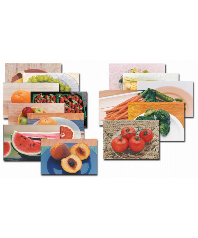 Set of 14 Fruits & Vegetables Posters includes: Apples, Banana, Grapes, Orange, Watermelon, Strawberries, Peach, Grapefruit, Corn, Tomato, Broccoli, Carrots, Peas and Salad.