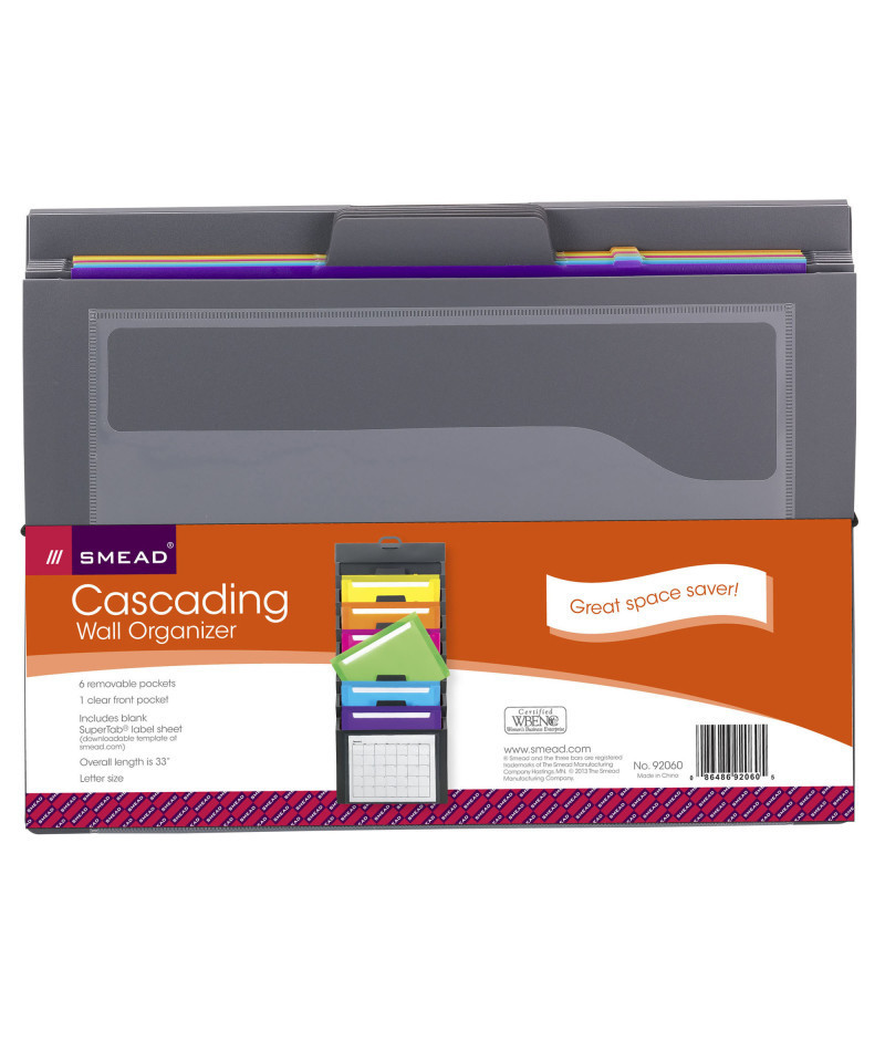 The Cascading Wall Organizer saves desk space by utilizing often overlooked wall space. The 6 cascading pockets are removable to make viewing and access to documents easy. An elastic cord closure allows for secure and easy transport. Colored pockets each hold 50 sheets. Clear pocket on front allows for extra storage. Convenient loop on top for easy hanging. Durable poly material is tear and moisture resistant. Blank label sheet included.
