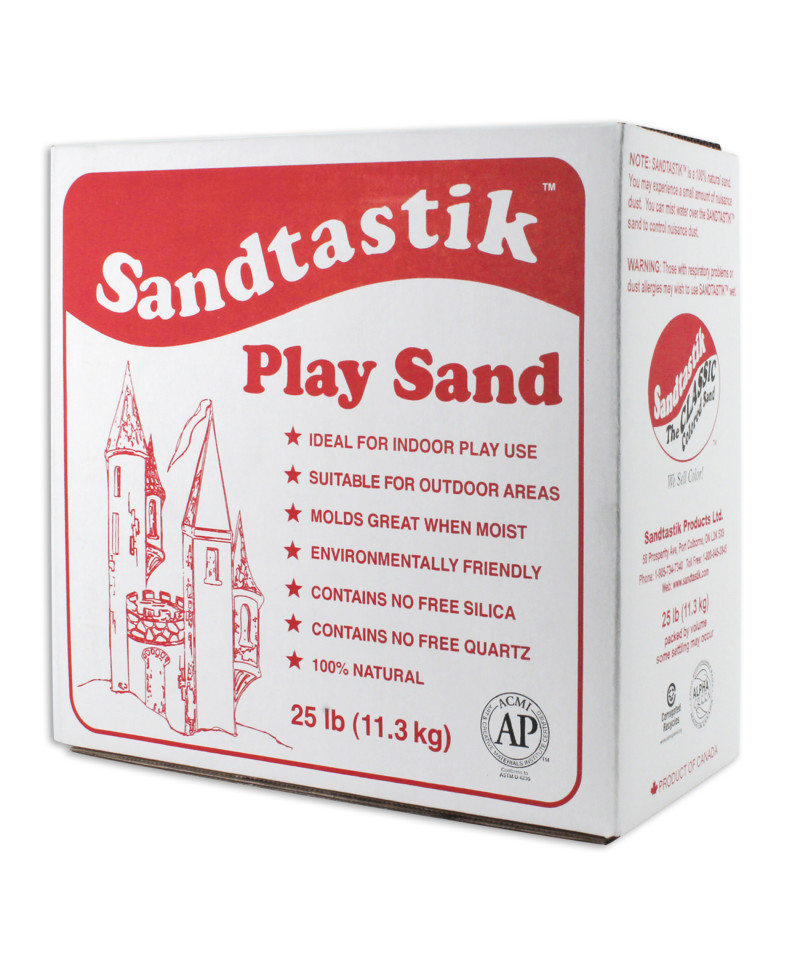 PLAY SAND WITH PEACE OF MINDChildren are naturally inspired by the simplicity of soft granular sand - a boundless medium. Watch as they will dig, pile, sift, compact and more. Sandtastik® Sparkling White Play Sand provides tactile and sensory stimulation necessary for the development of a child's imagination, hand-eye coordination, and fine motor skills such as shoulder stability, forearm rotation, wrist control, and hand strength. Sand play also encourages creativity, visualization and social interaction.