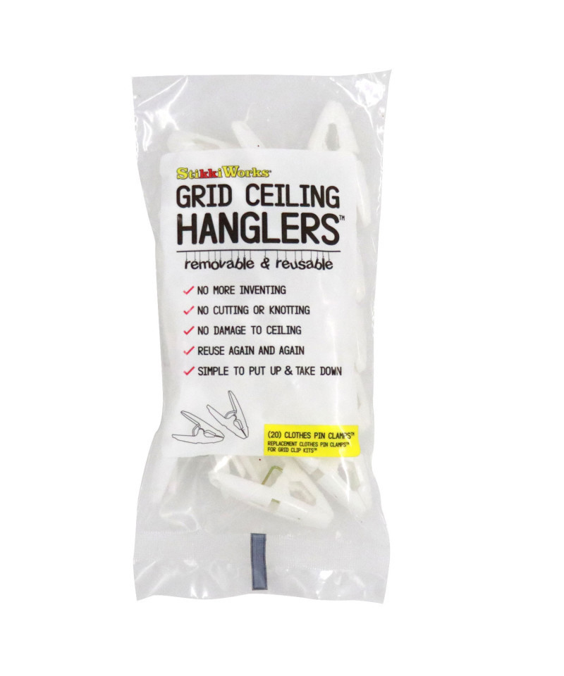 Clothes Pin Clamps™ are 2" clamps that have a strong grip for hanging papers, posters, models, mobiles and other lightweight to medium weighted objects. These clamps feature two holes for easy threading and work with Grid Clip Strings™ or can be used as replacement clamps for Grid Clip Kits™. Each bag includes 20 Clothes Pin Clamps™.