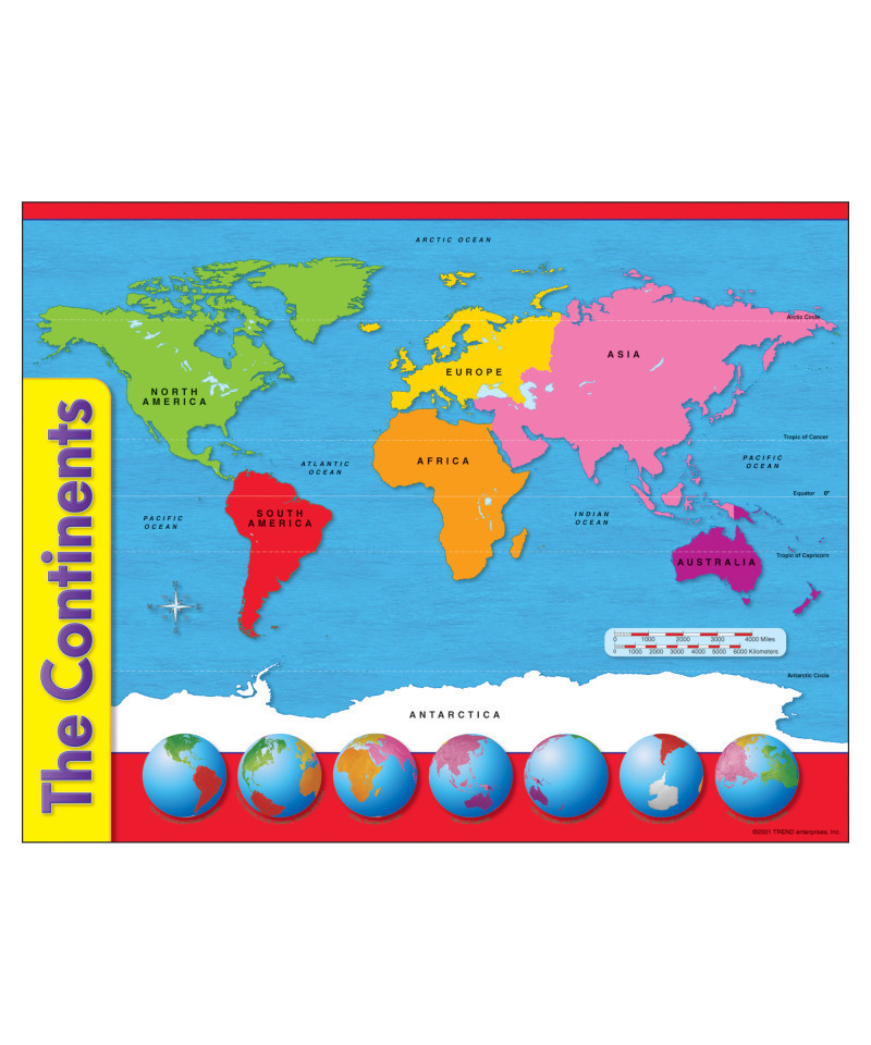 Colorful chart shows continents and world's oceans. Distance scale in both miles and kilometers is included The back of the chart features teacher-created reproducible activities, subject information, and helpful hints. 17" x 22" classroom size.