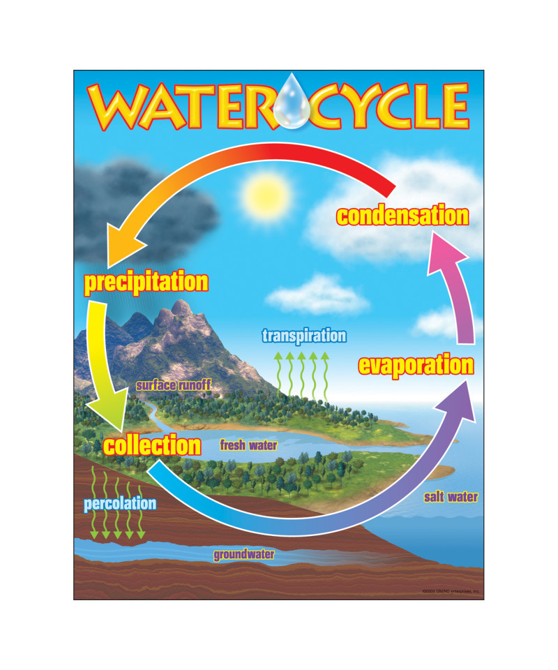 Precipitation, collection, evaporation, condensation, and then start the cycle again. Introduce your class to the water cycle with the illustrations and activities on this chart. Durable. Extra Value: Reproducibles on back. 17" x 22".