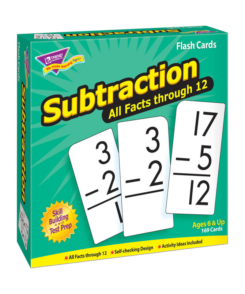 Content-rich math cards do their job, teaching students new skills in a fun way. This educational aid helps students build subtraction skills. Equations are presented 2 ways to reinforce skills. Complete tables for all numbers 0-12. Self-checking, answers on back. Sturdy cards and storage box. Students will delight in mastering new skills. No-see-through cards with quick-sorting, rounded corners. quick-sorting, rounded corners. Includes 169 cards, 3" x 6". For ages 6 and up.