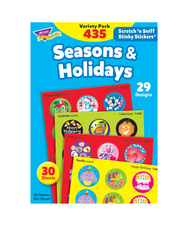 Scratch 'em and sniff 'em for a burst of fragrance! Everyone's favorite stickers, Stinky Stickers are fun to collect or use to motivate and reward. Designs include Happy Birthday, Valentine's Day, Water Play, Halloween, Thanksgiving Time, and Christmas. Designs may vary. Acid free, nontoxic, and safe for use on photos. Each pack includes 29 designs, 435 stickers, 6 scents.