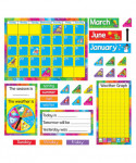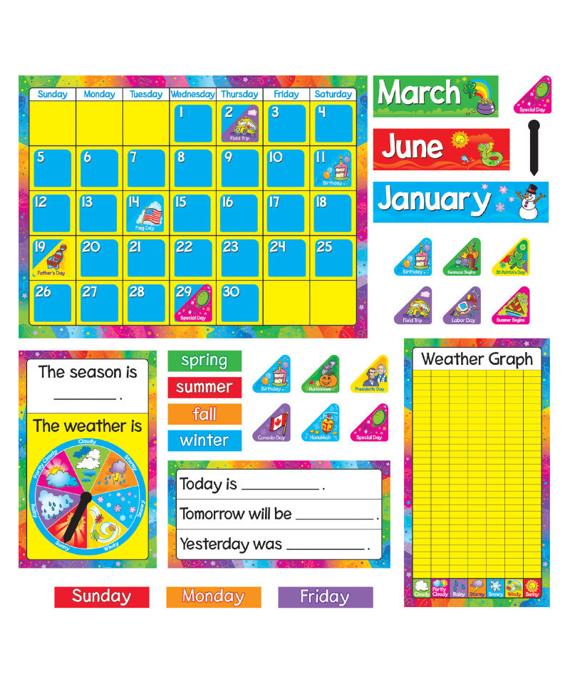 Highlight holidays and special days with colorful tabs that easily slide into the calendar. Includes 17.5" x 23.25" calendar, 12 month labels, 7 days of the week labels, 4 seasons labels, season/weather chart, 33 date markers, 44 holiday/special day markers, Today/Tomorrow/Yesterday chart, weather graph, and 2 arrows. 106 pieces. Includes a Discovery Guide with creative activities that teach and delight!