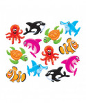 Vibrant designs energize spaces and delight and engage viewers. Label containers, lockers and centers, accent displays, decorate walls and posters, showcase student work, inspire creative writing, and reward accomplishments. Endless possibilities! Precut and ready to use in red, green, purple, and blue. Durable and reusable. 6 designs, 6 of each, left and right-facing. 36 pieces, 5.5" - 6" tall. Coordinates with Sea Buddies Collection.