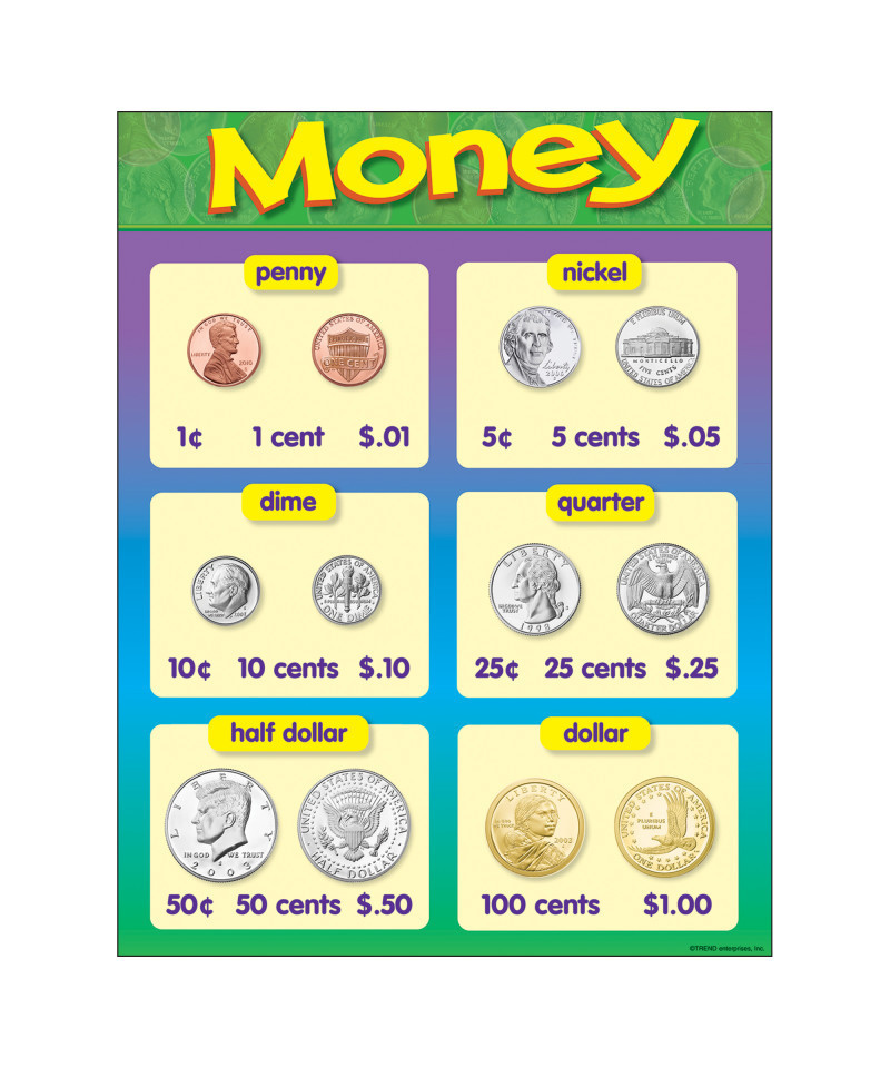 Photographs of the fronts and backs of coins including penny, nickel, dime, quarter, half-dollar, and dollar. Includes coin values in numbers and words. Durable. Extra Value: Reproducibles on back. Measures 17" x 22".