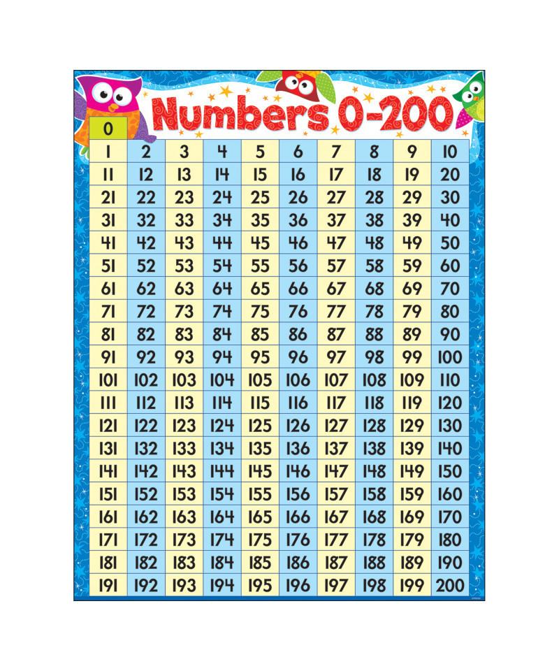 - Unique chart presents numbers 0 to 200 in space-saving format. Count by tens, show skip counting.