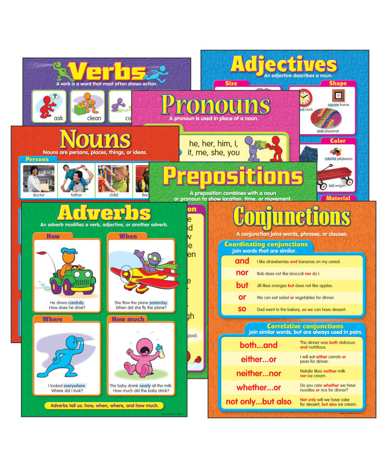 Create inviting, exciting spaces with playful characters and lots of learning! Convenient seven-chart pack for Grades 2-5 includes Pronouns, Conjunctions, Prepositions, Nouns, Verbs, Adjectives, and Adverbs. Extra Value: Reproducibles on back. Durable. 17" x 22".