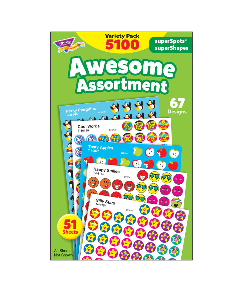 Popular superSpots® pack proves variety is the spice of life! Bright colors and amazing designs to motivate, collect, trade, and celebrate success. So many uses! Acid free, nontoxic, and safe for photos. 67 designs (Perky Penguins, Fabulous Fish, Sports Balls, Star Brights, Totally Buggy, Happy Smiles, Super Words, Cheer Words, Cool Words, Silly Stars, Frog Fun, Tasty Apples) 5,100 stickers.
