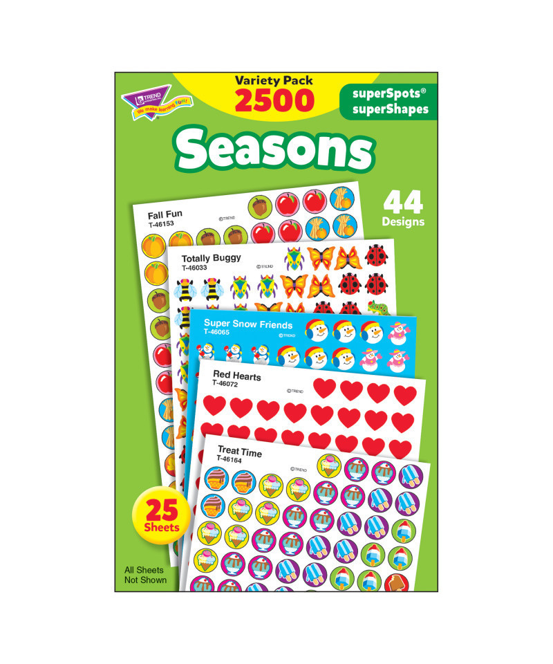 Variety and value that can't be beat! Assorted superSpots® and superShapes stickers are a great way to reward progress and everyday achievements. 25 sheets, 2500 stickers. Actual sticker sheets may vary from photo.