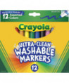 Kids love to get creative with color, but parents want to keep the color where it belongs and easily remove it where it doesn't! The world's most washable non-toxic markers now come in an improved Ultra-Clean formula that washes easily from skin, clothing, and common household surfaces—even painted walls. Classic Broad Line Markers provide artists with classic Crayola colors that feature Color Max, our most vibrant color yet. Amp up school projects and artistic endeavors with high-quality ink that is true to color. The variety of bright colors in this pack invites imaginative expression. With its conical tip, the Classic Broad Line Marker is a versatile drawing tool. Perfect for coloring in large areas, these markers are also great for drawing thin lines or dots. Kids can even create a ribbon effect with lines that taper from thick to thin. Broad line markers lay down plenty of color and won't smudge or bleed through paper. Crayola Markers contain recycled resin, which puts over a million pounds of plastic back to use. Bring beauty and color to your world and help keep plastic out of landfills. Each box includes 12 Ultra-Clean Washable Broad Line Markers in assorted colors and peggable box.