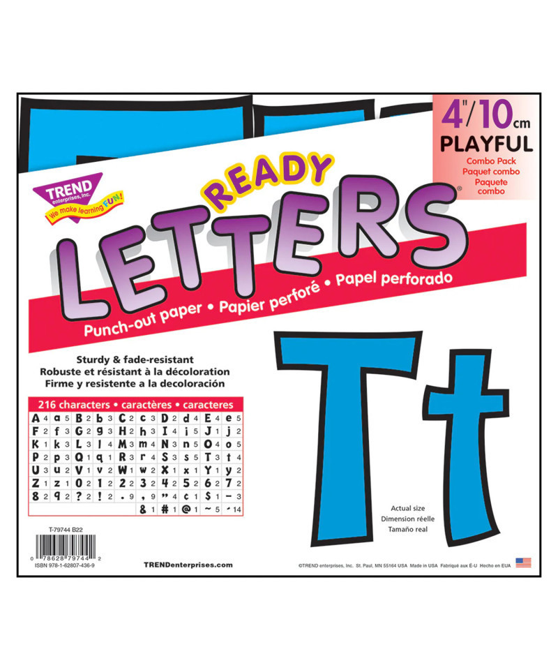 Lively letters, limitless possibilities! Convenient, reusable, and easy to use! Great for student work displays, bulletin boards, signs, banners, news boards, learning activities, labeling, and much more! Fade-resistant colors coordinate with TREND products. Durable and reusable. Includes 59 uppercase letters, 84 lowercase letters, 20 numerals 0-9, 35 punctuation marks, and 18 Spanish accent marks.