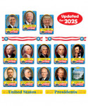 This bulletin board set is an important teaching aid to help present and discuss American history, our democratic processes and institutions, and issues of representation and justice. Display 5" x 8 1/2" official White House portraits of the 46 U.S. presidents along with 2 specialty cards (White House, Oval Office), 3 versatile header cards, and 3 stars and stripes streamers. 54 pieces, updated for 2021. Includes a Discovery Guide with creative activities and lesson ideas.