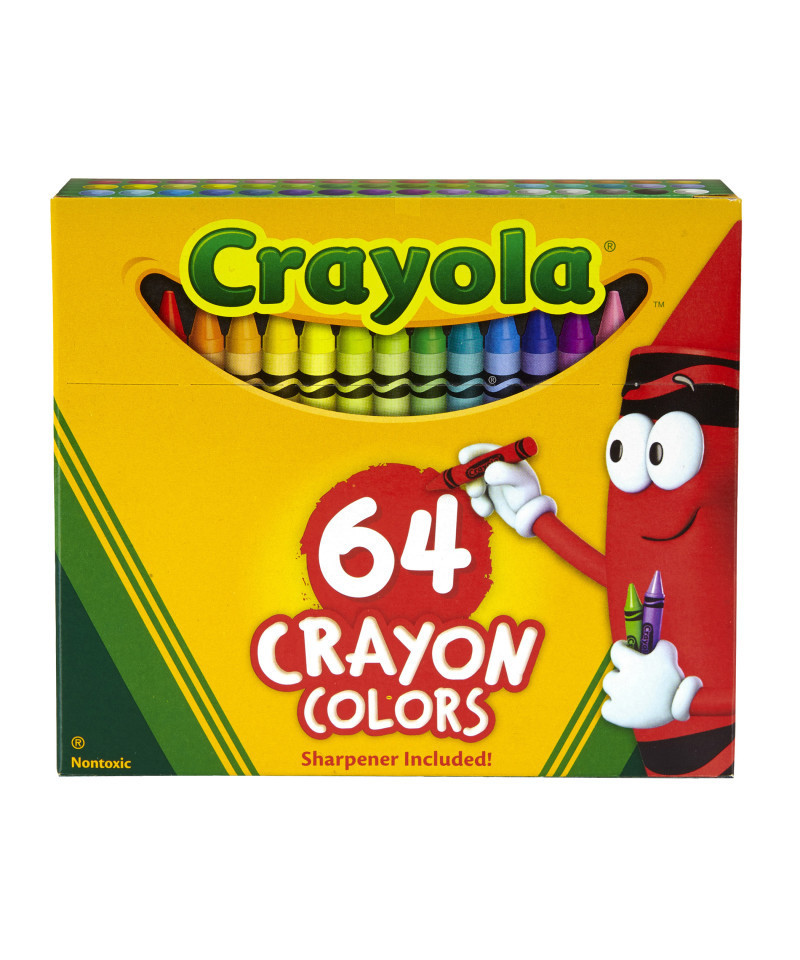 Crayola Crayons provide color-loving kids with 64 hues that feature vibrant, long-lasting color. Amp up school projects and artistic endeavors with high-quality results. The variety of bright colors in this pack invites imaginative expression. Kids will love to use these vividly colored, durable crayons at home or at school. In addition to classic Crayola colors, this classic 64-count box contains fun shades such as carnation pink, indigo, and scarlet, so you can mix and match to create colorful drawings and bold signs. Crayola Crayons can last 35 percent longer, based on square foot coverage against key competitors. Children can enjoy drawing more pictures and filling coloring books even longer. Crayola art supplies and activities help children express, create, and connect through colorful play. Each box includes 64 Crayola Crayons with crayon sharpener in box.