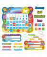 Rainbow-bright colors and lots of extras! Includes 26" x 31" calendar, 12 month labels, 7 days of the week labels, 4 seasons labels, 2 sets of 33 date markers, 62 special day markers, 7 weather labels, Yesterday/Today/Tomorrow sign, Season/Weather sign, and 4 blank signs for customization. 165 pieces. Includes a Discovery Guide with creative activities that teach and delight!