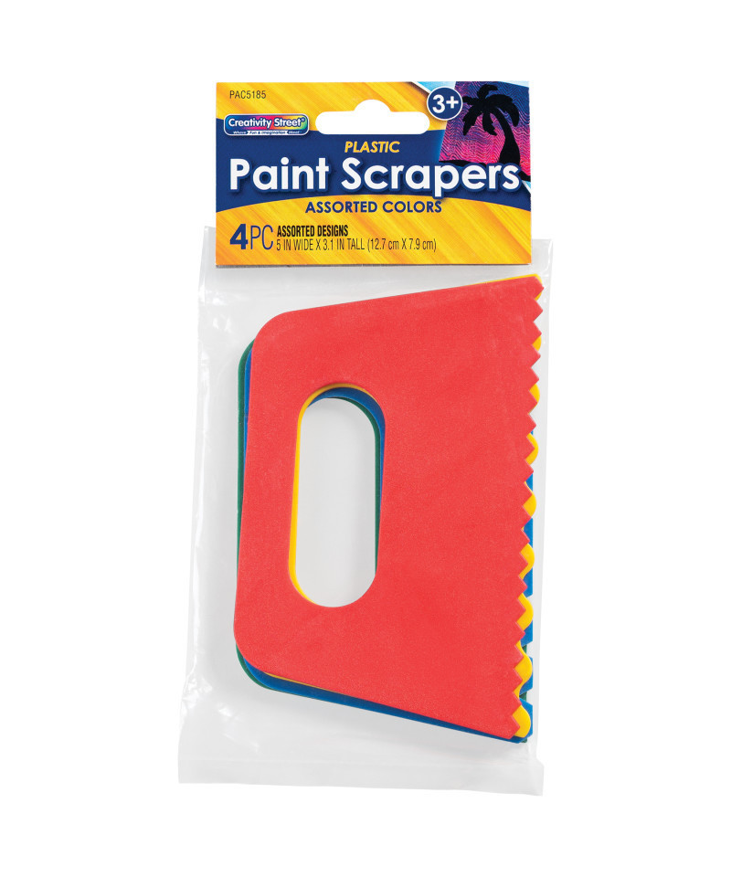 Durable set of all plastic paint scrapers in four different designs. Each scraper is 5" wide and allows kids to create patterns, blend different colors, and play with shapes and designs.