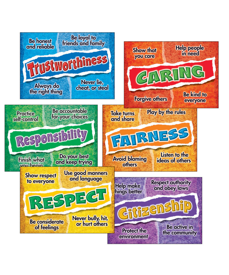 Lively visuals and popular themes energize learning, spark discussions, build character, and encourage new ways of looking at life. The results are motivated, successful individuals who reflect the positive attitudes and behaviors portrayed in these creative themes. Includes Trustworthiness, Caring, Respect, Citizenship, Fairness, and Responsibility. Versatile and durable. Value-packed savings! 6 posters, 1.375" x 19".