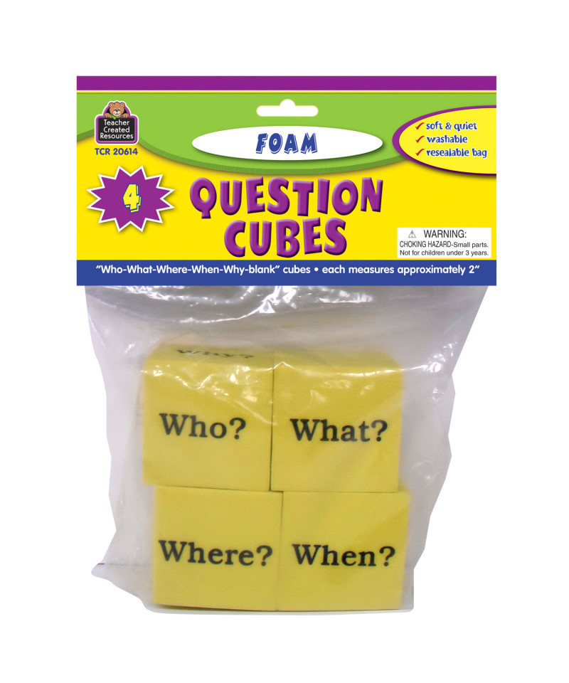 Four 2-inch cubes get discussions and/or stories started. Each cube has Who? What? When? Where? Why? and one blank side. Foam is lightweight, soft, quiet, and washable. Square edges stop the cubes from rolling too far. Comes in a resealable storage bag. Teaching tips are included.