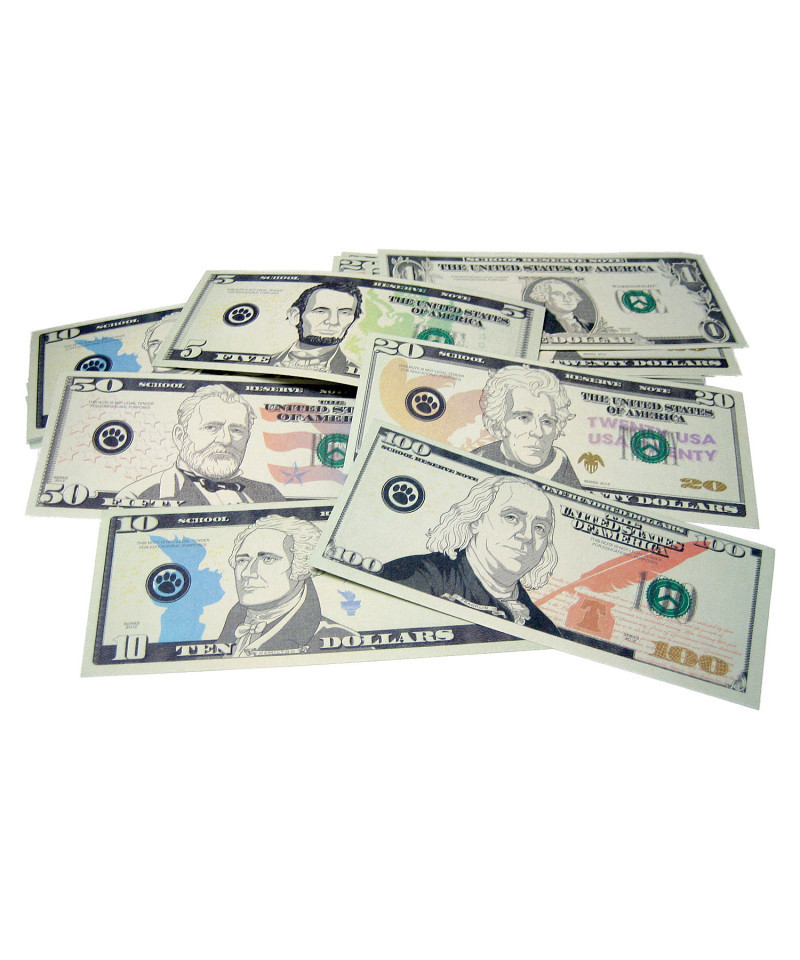 Practice math skills with real-world applications. Includes 110 bills: 35 $1, 25 $5, 20 $10, 5 $50, and 5 $100. Bills are 5 1/4" x 2 1/4" in size. Comes in a resealable storage bag. Teaching tips are included.