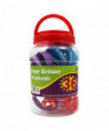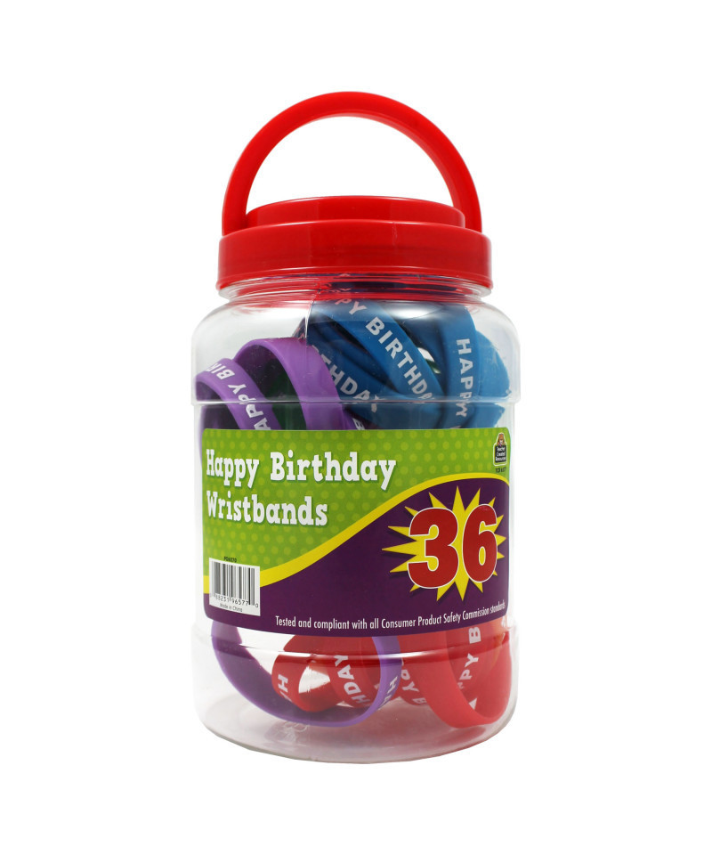This cute jar of wristbands will come in handy when it is time to acknowledge student birthdays. Includes an assortment of 36 Happy Birthday wristbands. Made of silicone. Tested and compliant with all Consumer Product Safety Commission standards. Circumference measures 7.25".