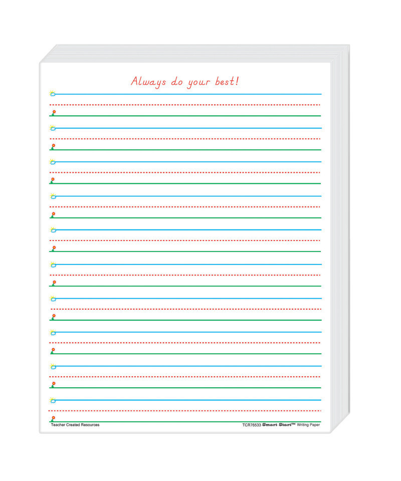 Smart Start Writing Paper (8-1/2" x 11") is truly a "Smart Start" for beginning and experienced writers. Bold graphics in blue, green, and red promote the feeling of success as children simply "Start at the Sky and pull down to the Ground" to form letters correctly. 1-2 Writing Paper lines have 5/8" spacing. Package includes 360 sheets.
