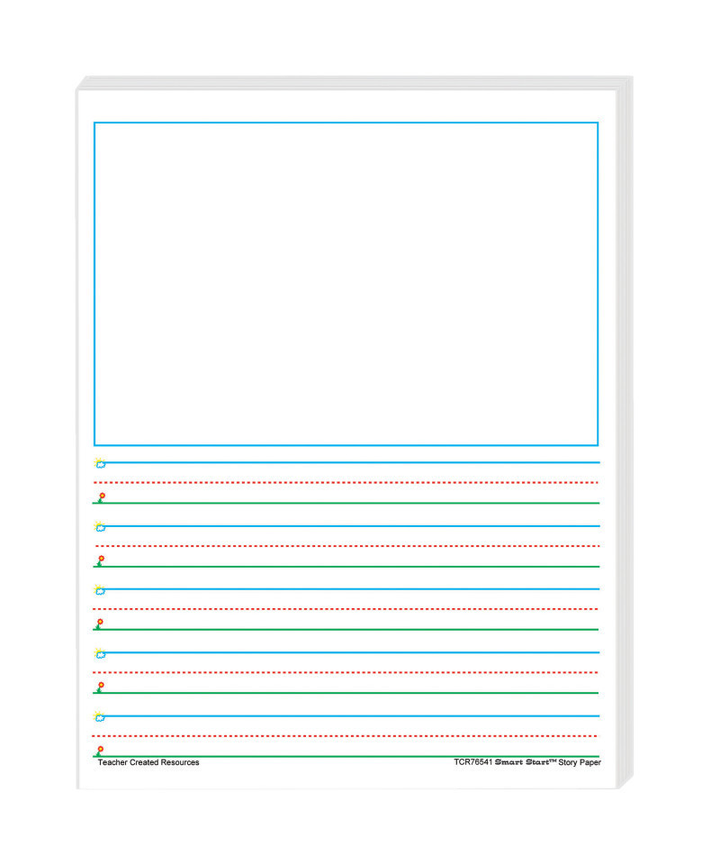 Smart Start Story Paper (8-1/2" x 11") is truly a "Smart Start" for beginning and experienced writers. Bold graphics in blue, green, and red promote the feeling of success as children simply "Start at the Sky and pull down to the Ground" to form letters correctly. 1-2 Story Paper has space for a picture and lines with 5/8" spacing. Package includes 100 sheets.