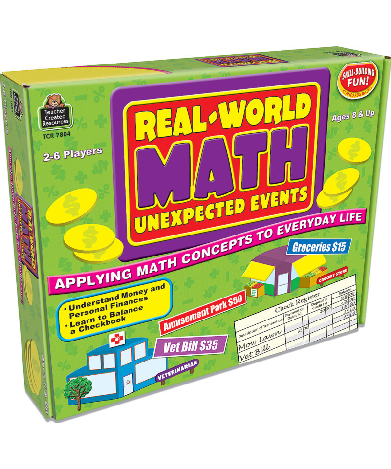 Help students see the relevance of math skills. Each player begins with a checking account balance of $100. In turn, each player sees how many spaces to move and picks up an "unexpected event" card. According to the card's instructions, the player either adds or subtracts an amount from his or her account (e.g. receiving a birthday gift or taking the cat to the vet). The first player to reach the end receives a bonus amount. Players then add up how much money they have in their accounts; the one with the most money wins. The game board comes with 50 unexpected events cards, 20 sheets of a check register (reproducible), and 6 game pieces. For 2-6 players. Ages 8 & up.