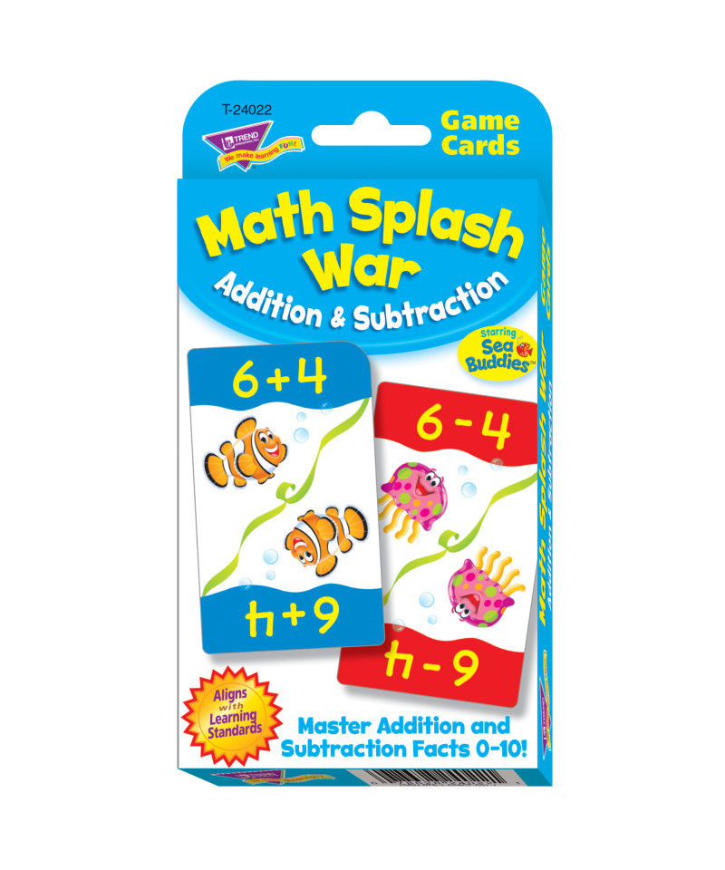 Splash into math with a fintastic game that develops essential math skills. Master addition and subtraction facts 0-10, and greater than, less than, and equal to skills. Players solve math problems and collect the most cards to win. Ideal for school, home, and on the go. 54 Game Cards, 1 Activity Card, and 1 Answer Card. 56 two-sided cards, 3.125" x 5.25". Coordinates with Sea Buddies Collection.