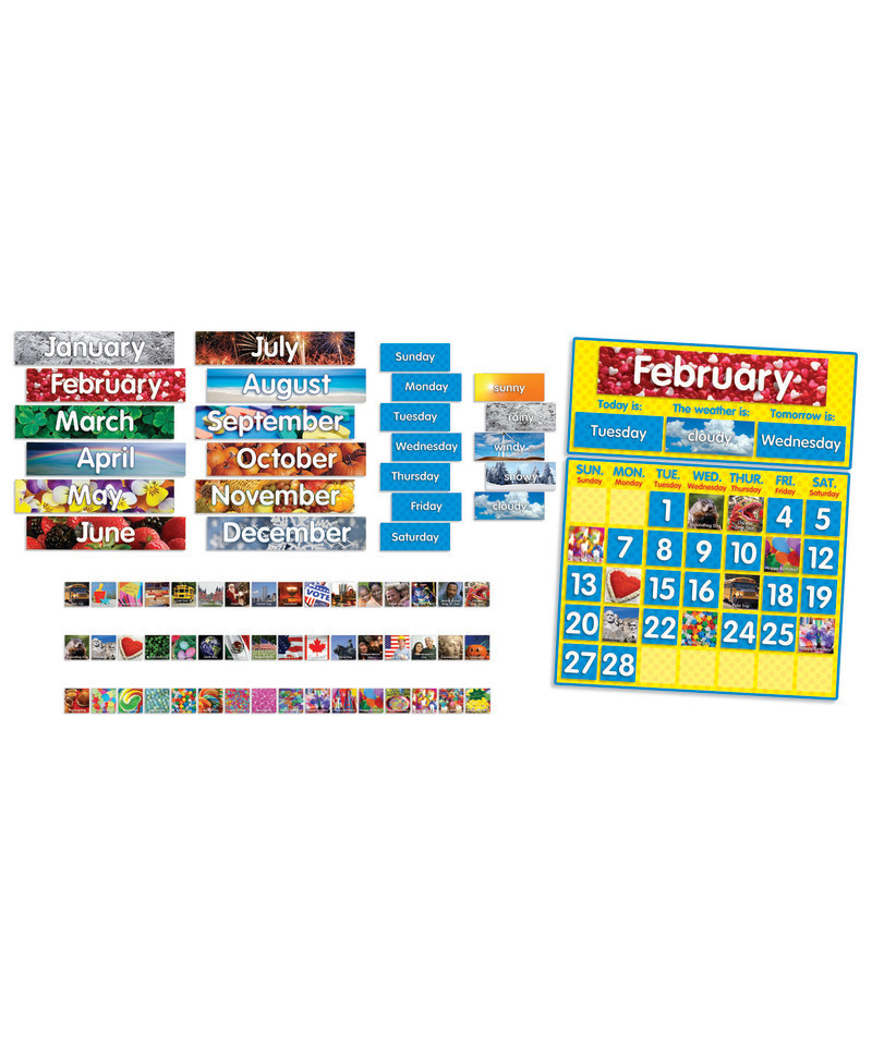 Bright, colorful photographs make this highly engaging calendar a must-have in every classroom! Includes a large, blank calendar frame, 12 monthly labels, 7 day-of-the-week cards, 33 date cards, 48 special day cards, and 5 weather cards. Includes an activity guide.