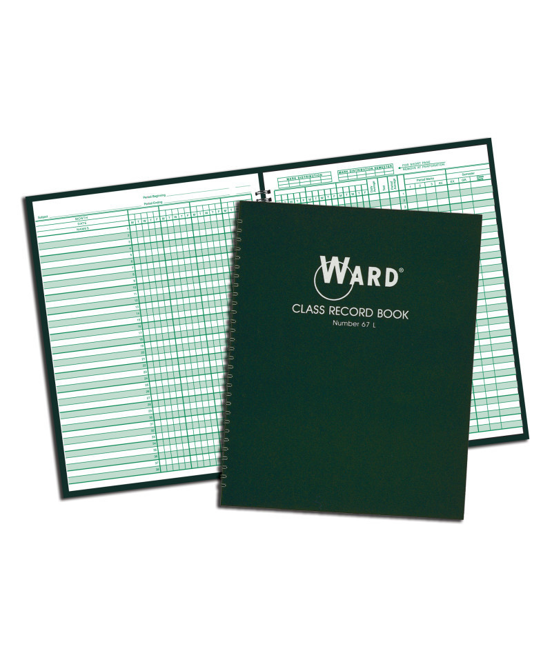 Ward books are as durable as they are functional, featuring the heavy, dark green cover material that users have come to rely on in WARD products. All WARD CLASS RECORD BOOKS are printed in green ink on quality white paper and bound in a durable, deep green cover. Semi-concealed wire binding allows the book to open flat for ease of use. Memorandum sheets and seating charts included in all books. 6-7 week grading periods. 8 1/2 X 11. 38 student names per page. Six grading periods with grading sheets for 36 to 42 weeks of school and 16 classes per year.