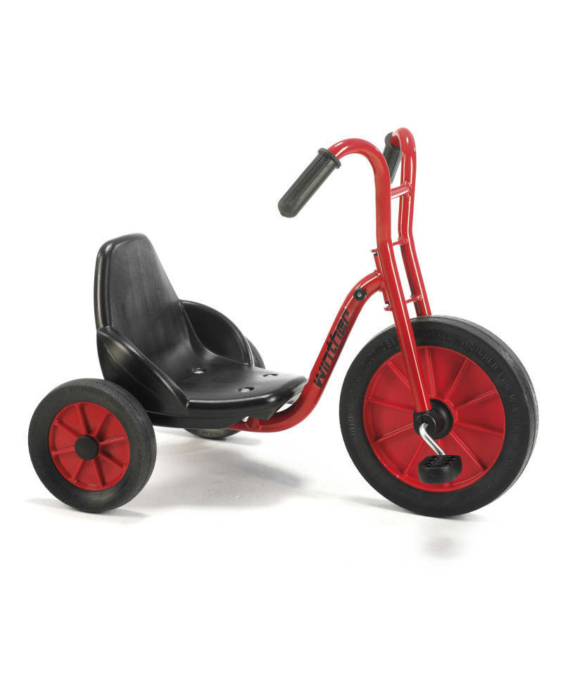 It's red and it's very cool. It has a low seat and a Harley-type handlebar. The large front wheel lets children work up a good speed and maintain momentum. We have even seen "big boys" cry when it was time for lunch and they had to stop playing with it. Harmonious, safe design with no sharp edges. Strong, oval-shaped tubes ensure maximum strength. Rubber stops to ensure children do not get fingers caught. Spokeless wheels with solid rubber tires. Strong, non-slip pedals. Solid one-piece steel crank.