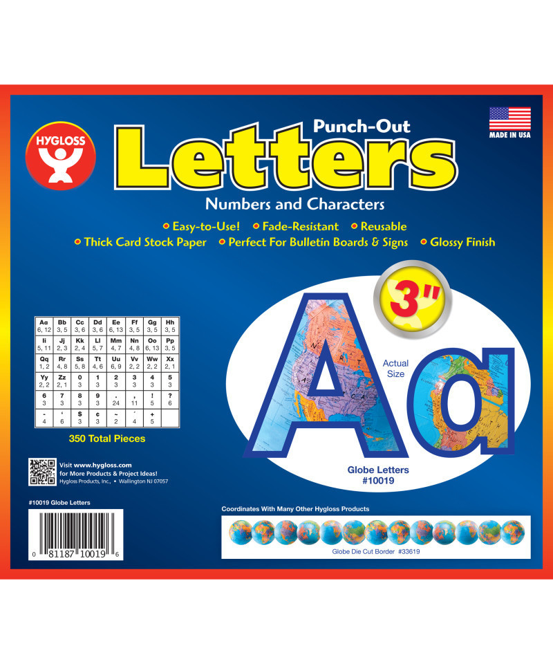 Our Punch-Out Letters in Globe design are the perfect way to help introduce your class to the concepts of Travel, Geography, Languages, History and more! These letters measure 3 inches tall. They are printed on premium quality card stock with a glossy globe-design finish, making them durable and easy to use. Each pack includes 350 characters.